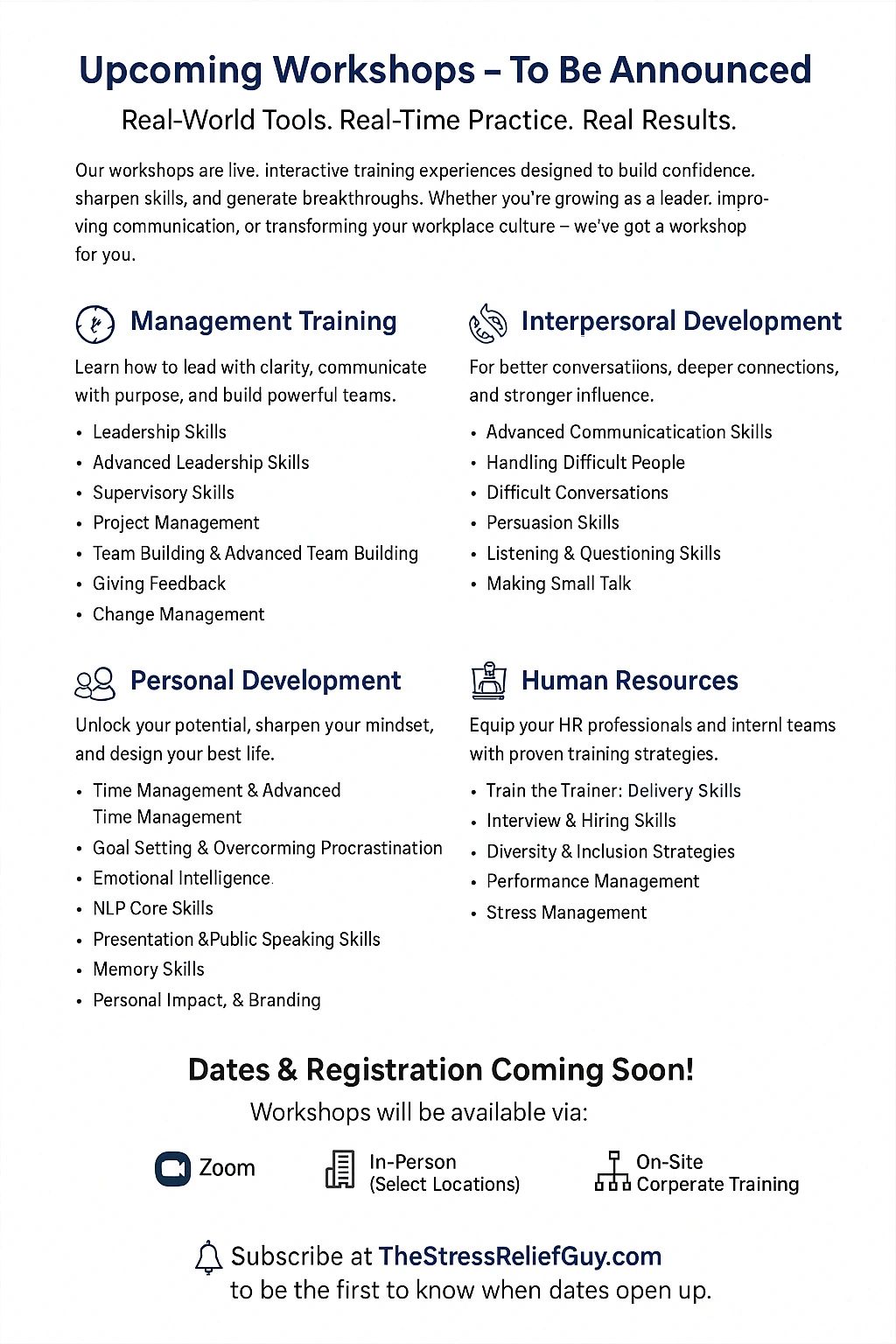 Subscribe at TheStressReliefGuy.com to be the first to know when dates open up!